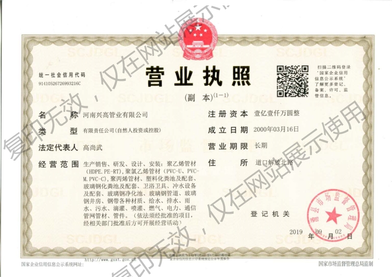 河南興高管業(yè)有限公司始建于1995年,是一家集塑膠管道系列產(chǎn)品的生產(chǎn)、研發(fā)、銷售、技術(shù)咨詢與技術(shù)服務(wù)于一體的企業(yè),注冊資金1.1億元。位于河南省安陽市滑縣道口解放北路經(jīng)濟開發(fā)區(qū),占地60000平方米。
