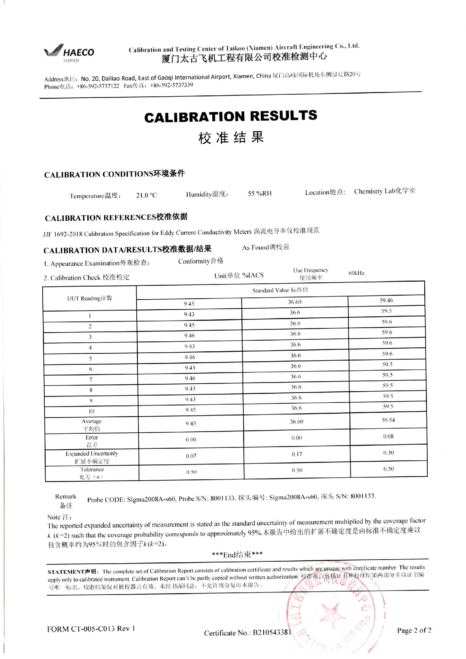 太古飛機工程檢測電導率儀校準證書