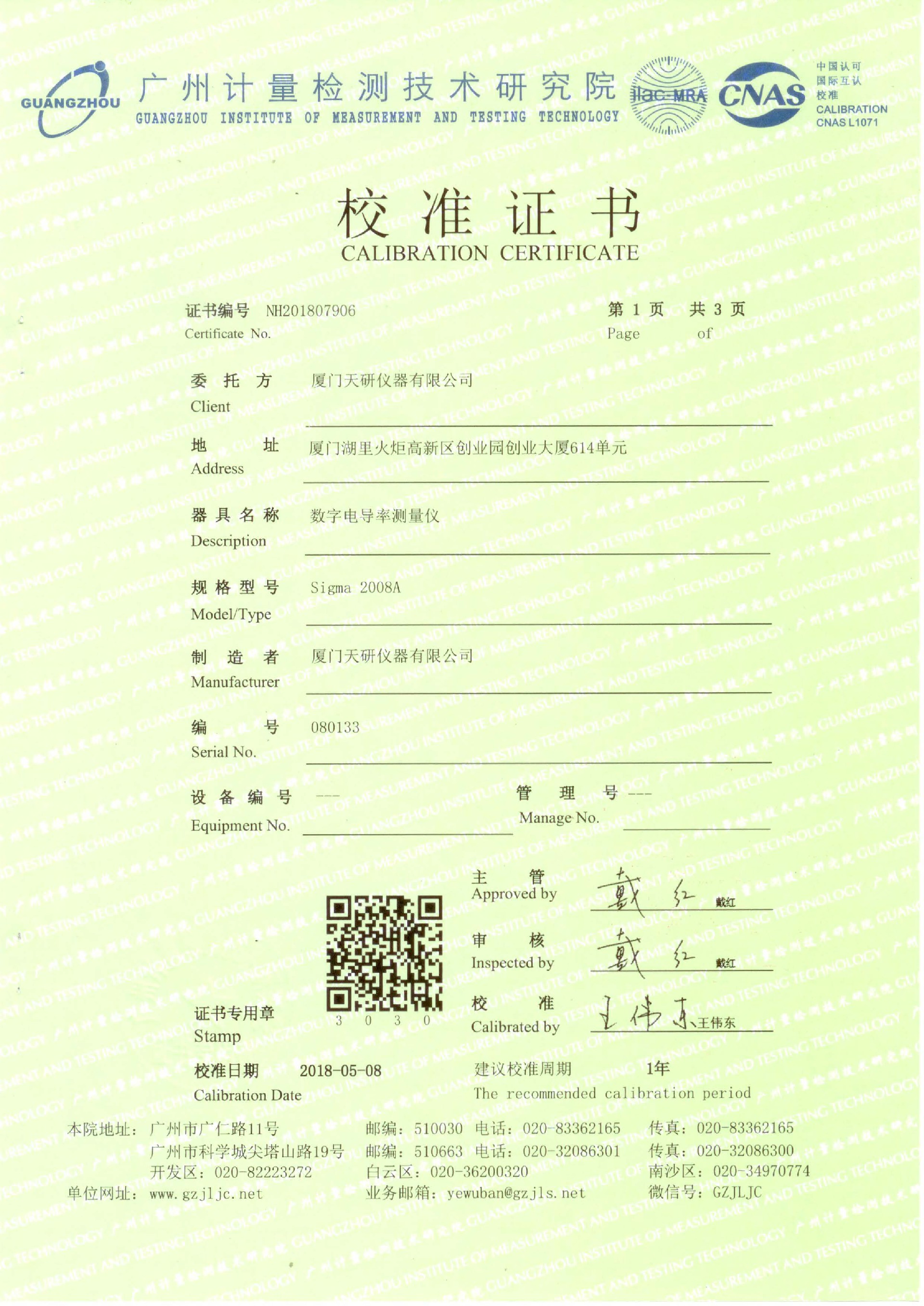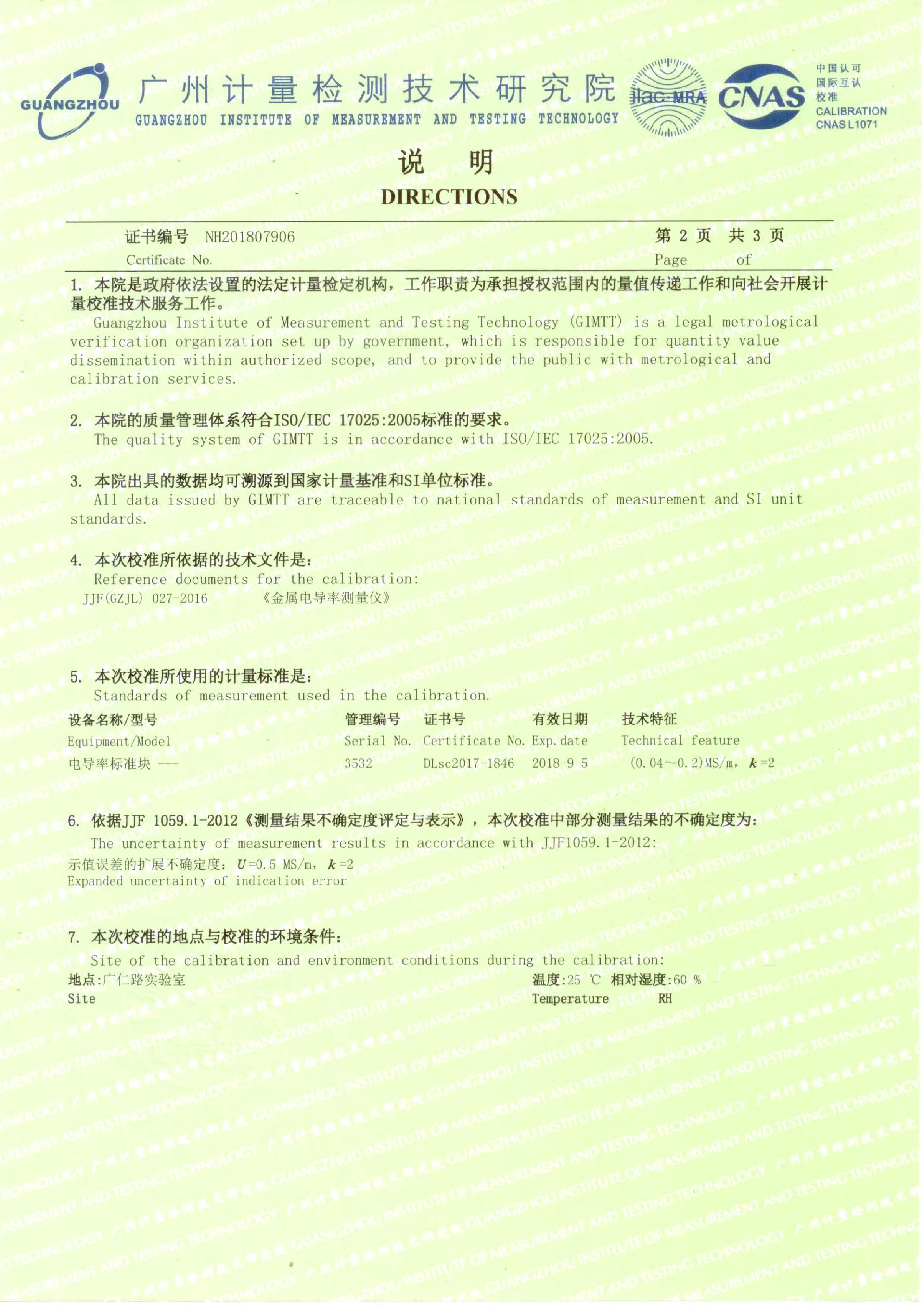 廣州計(jì)量院渦流電導(dǎo)率儀檢定證書